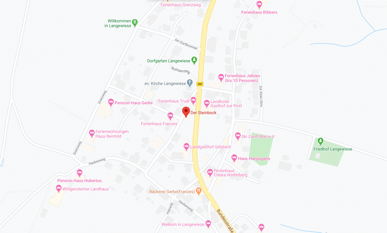 Unser Ferienhaus „Der Steinbock“ liegt direkt an der Bundesstraße in Winterberg-Langewiese. Diese Hauptstraße führt direkt in den Ortskern des beschaulichen Städtchens und wird auch von einer Buslinie befahren. Eine Haltestelle befindet sich sogar direkt vor der Haustür.