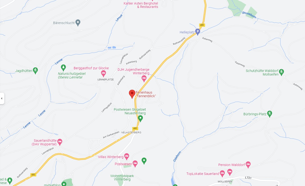 Unser Ferienhaus liegt in einer privaten, gemütlichen Ecke Winterbergs und ist dennoch gut an das Verkehrsnetz angebunden. Der Astenweg ist eine Seitenstraße, die von der B480 abgeht. Die B480 kann erreicht werden von der